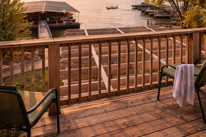 Outdoor dining area with lake views
