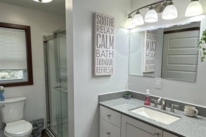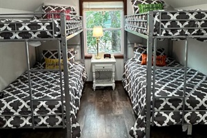 The upper level has a bunk room with two twin/twin bunk beds, a full-size bathroom, a queen sleeper sofa, and a mounted TV in the living area. With extra mirrors, vanities, and hooks in each room, this space is thoughtfully designed to accommodate everyone’s getting-ready needs!